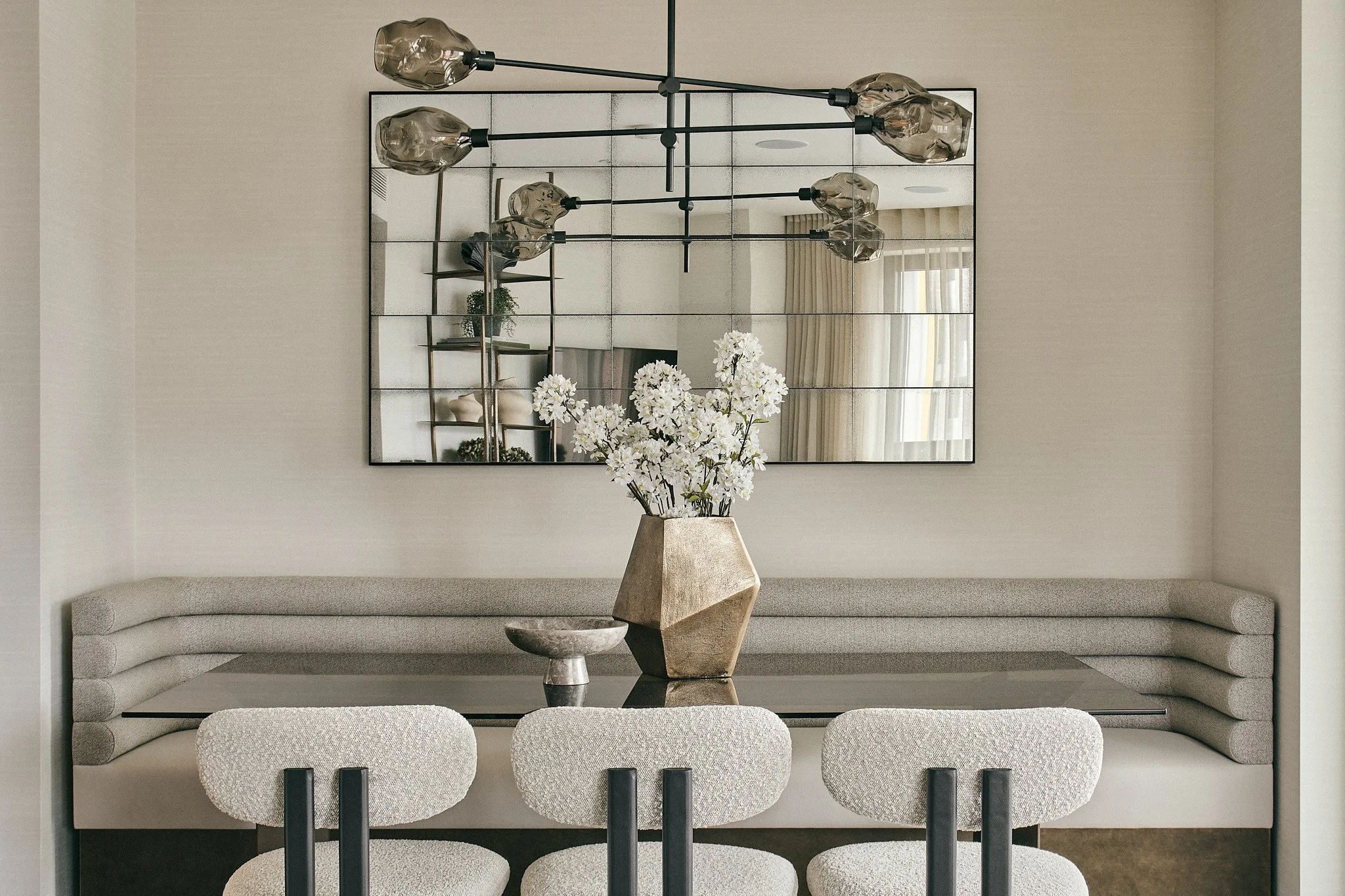 Finishing the space is the statement Khai Pendant. With intersecting bronze arms and hand-blown smoked glass shades, it anchors the dining area and adds a layer of contemporary elegance with an organic, timeless feel.