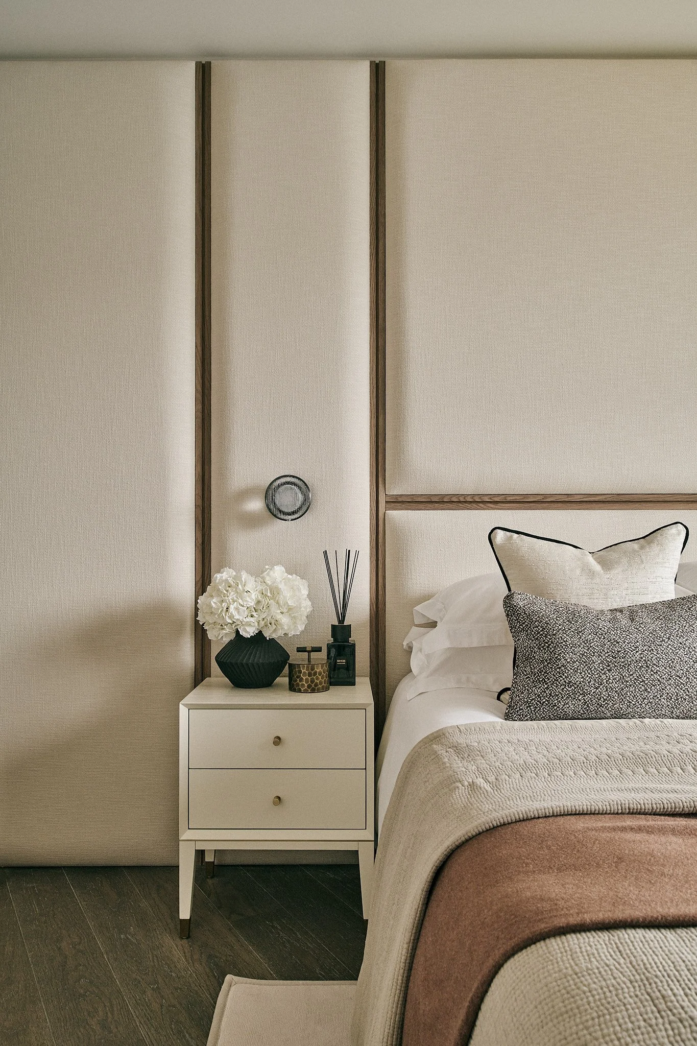 This guest bedroom feels calm, polished, and quietly luxurious. The design centres on a full-height upholstered headboard wall, wrapped in soft textured yarn and detailed with slim walnut trims. Framing the bed beautifully, it adds subtle structure and drama, while Marset Roc wall lights, part sculptural artwork, part functional lighting, turns the headboard into a striking architectural feature.