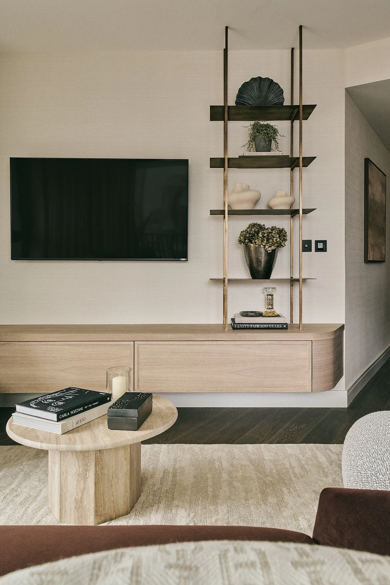 The real show stopper is the bespoke wall-hung TV unit. Its curved front and warm wood grain are balanced with brass shelving, giving the piece a strong sense of craftsmanship and individuality. Acting as both practical storage and a sculptural focal point, this one-of-a-kind design brings depth and character to the open-plan space.