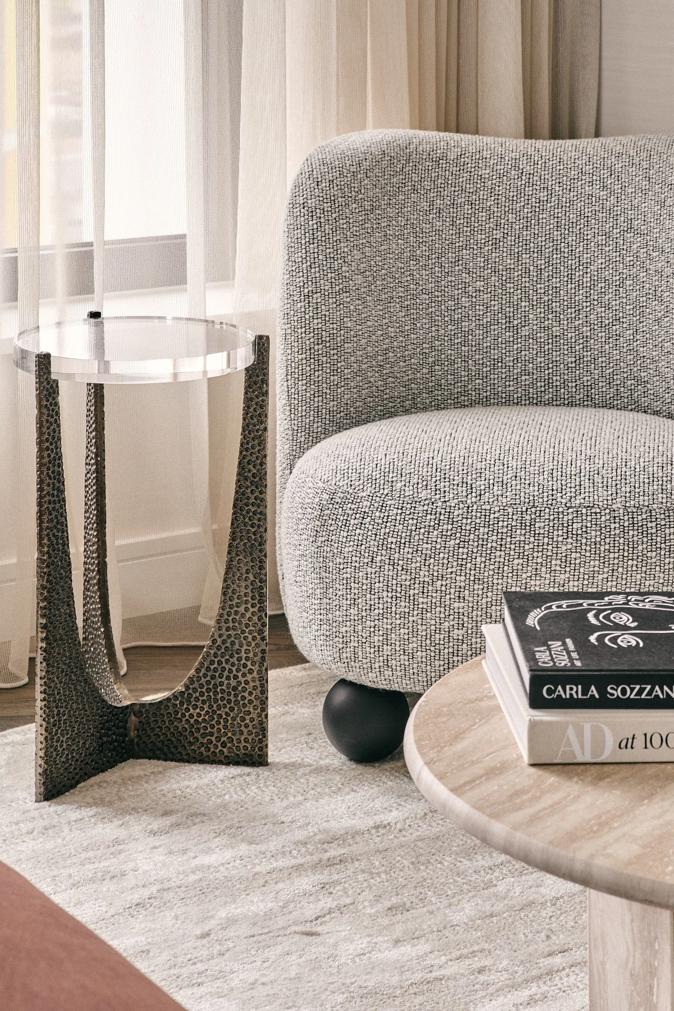 Completing the room is an occasional table with a thick crystal top and an antiqued bronze base in hammered steel, adding a subtle note of drama and a quietly luxurious finish.