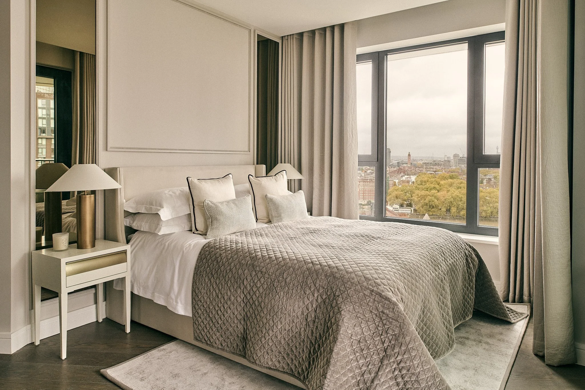 The brief for the master suite was simple: a calm, hotel-like sanctuary where textures and soft neutrals set the tone. Layered materials soft linens, natural timber, reflective mirrors, and subtle metallics bring a sophisticated yet approachable glamour to the suite. Every detail was chosen to maximise comfort, functionality, and let the stunning Nine Elms views take centre stage.