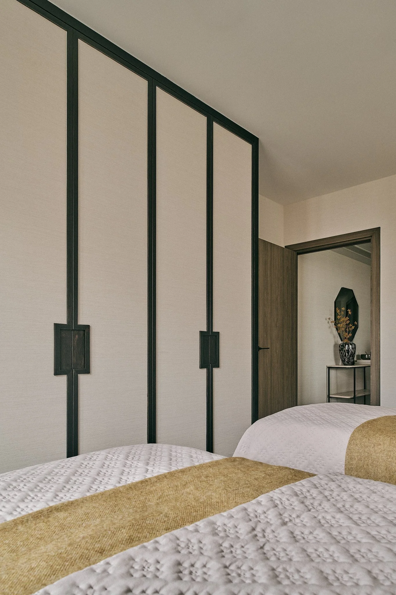 We proposed a bespoke upholstered twin headboard in soft linen-textured fabric, which was gently rounded for a welcoming feel. Between the bed is a vertical panel in subtle leopard-print for a playful touch. The organic-shaped wall lights in natural stone bring sculptural interest while floor-to-ceiling wardrobes provide practical storage without disrupting the calm, curated vibe.