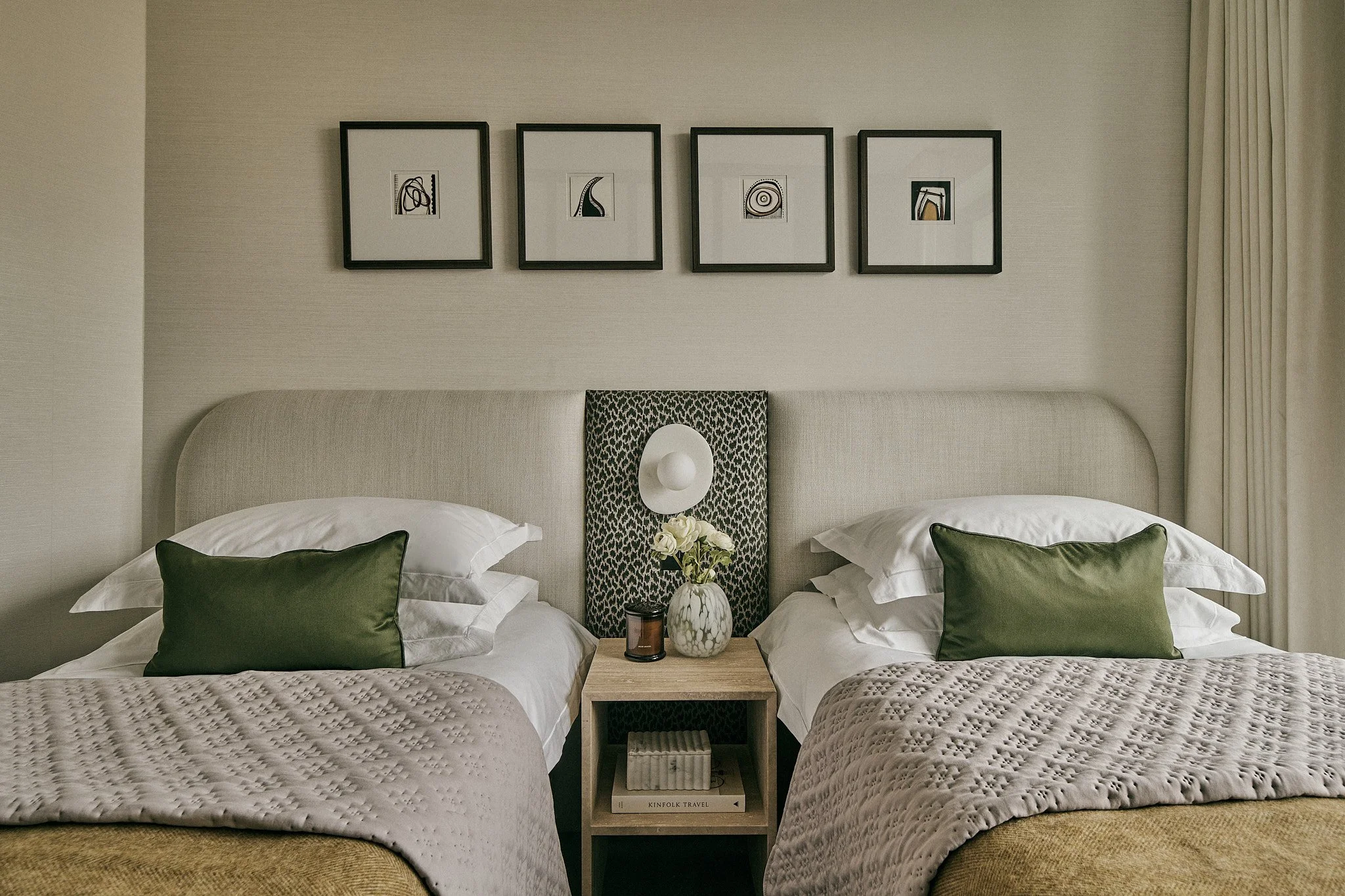 This twin guest bedroom builds on the design language of the master and second bedroom while adapting to different functional needs, keeping the home’s style cohesive. Soft curves, and pattern make the room versatile - perfect for visiting family, children, or guests.
